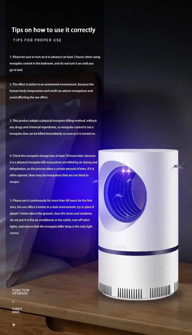 - When the mosquito killer is working, please turn off other light sources in the room. The darker the light, the better the effect